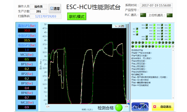 檢測臺由封堵夾具、測試系統(tǒng)、數(shù)據(jù)采集系統(tǒng)以及質(zhì)量追溯系統(tǒng)組成,配置有產(chǎn)品裝夾機(jī)構(gòu)、產(chǎn)品封堵及配氣機(jī)構(gòu)、產(chǎn)品配電機(jī)構(gòu)、氣壓測試系統(tǒng)、數(shù)據(jù)采集及分析系統(tǒng)等。測試臺采用高壓氮?dú)庾鳛闇y試介質(zhì),改變傳統(tǒng)的制動液測試,減少制動液對產(chǎn)品及生產(chǎn)環(huán)境的影響。通過密封性測試、電磁閥響應(yīng)測試、柱塞泵功能測試、蓄能器活塞測試等相關(guān)的部件功能測試和總成功能測試實現(xiàn)產(chǎn)品的性能判斷。